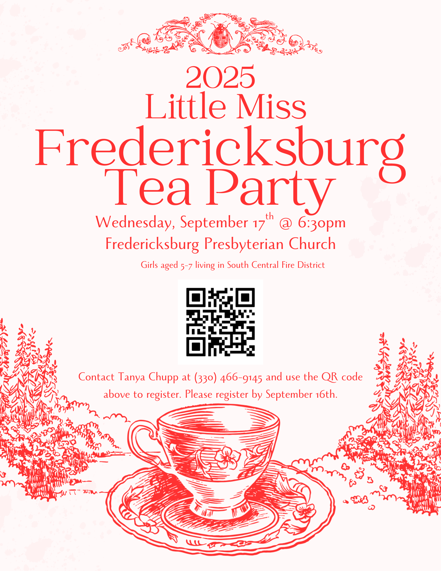 If you have a young girl (aged 5-7) who lives within the South Central Fire District that is interested in becoming Little Miss Fredericksburg 2025, please register by contacting Tanya Chupp at (330) 466-9145 AND by clicking the QR code found here. The Tea Party will be held at the Fredericksburg Presbyterian Church on September 17th beginning at 6:30 PM. Please register no later than September 16th.